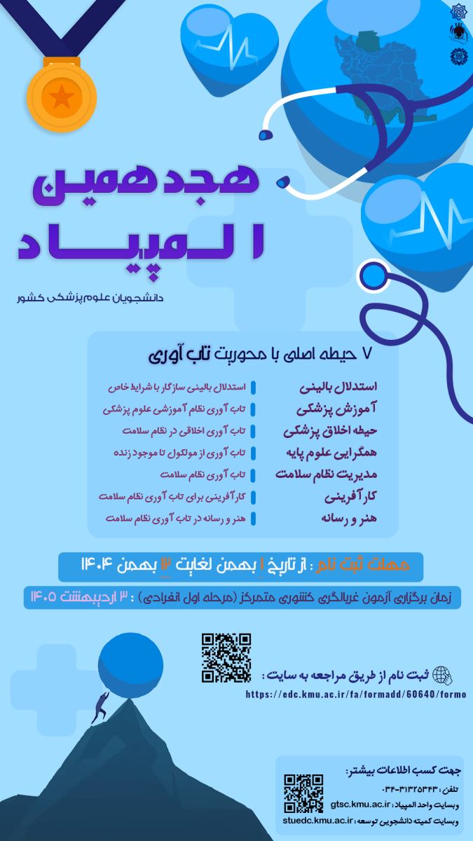 ثبتنام در هجدهمین المپیاد دانشگاه علوم پزشکی کرمان آغاز شد. دانشجویان میتوانند جهت شرکت در المپیاد با موضوع «تابآوری» و با عناوین اختصاصی حیطههای زیر، از اول بهمن 1404 لغایت 12 بهمن 1404 با مراجعه به سامانه ثبتنام اقدام به ثبتنام نمایند. لازم به ذکر است بازه زمانی مذکور به هیچ عنوان قابل تمدید نمیباشد. همچنین جهت طرح سوالات خود میتوانید با شماره تماس 03431325343 ارتباط برقرار نمایید. قبل از اقدام به ثبتنام حتما شرایط شرکتکنندگان هجدهمین المپیاد علمی دانشجویان علوم پزشکی سال 1405 را به دقت مطالعه نمایید، در صورت مغایرت با مقررات المپیاد، کمیته فنی موضوع را بررسی و تصمیمگیری مینماید و حکم این کمیته حتی پس از کسب مدال و رتبه نیز قابل اجرا میباشد.